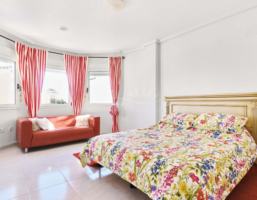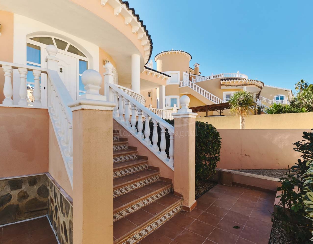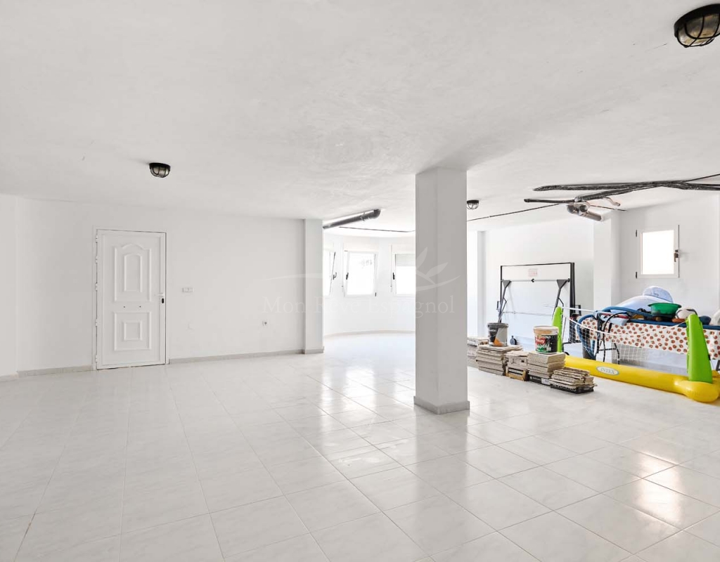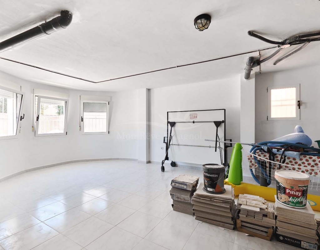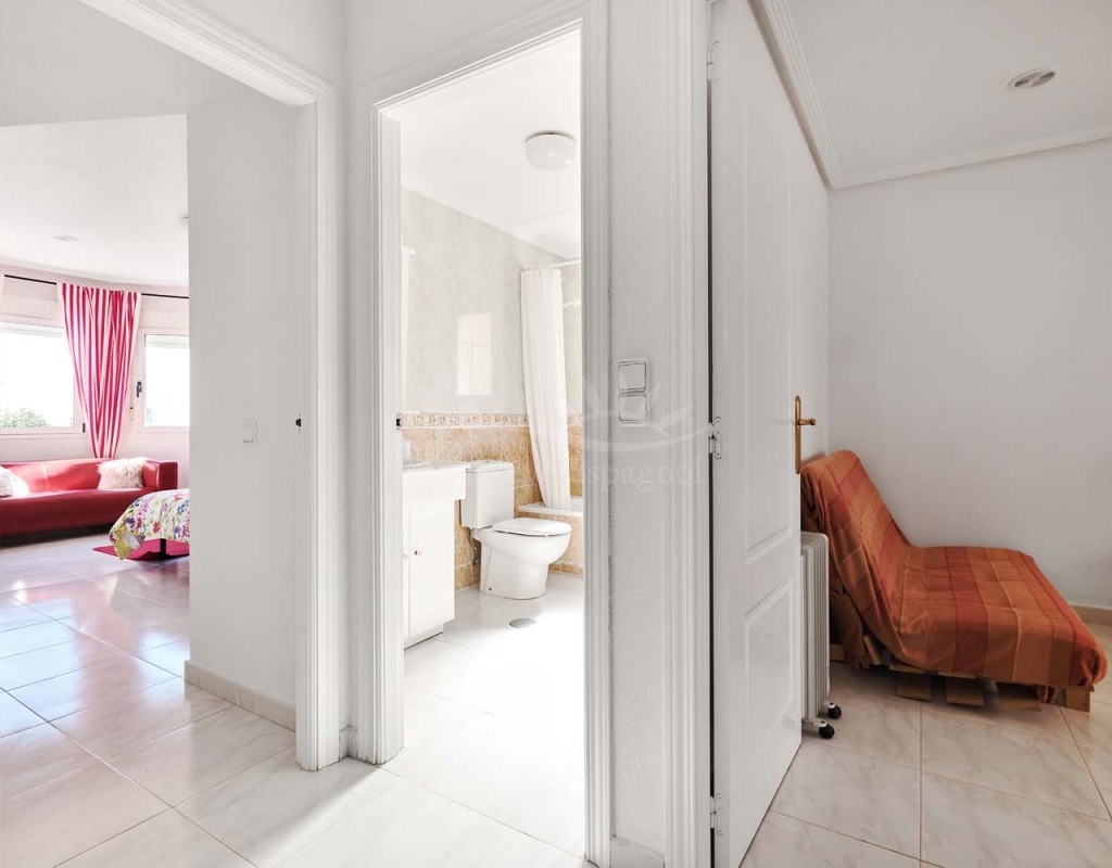 Un punto destacado de esta propiedad es su dormitorio de invitados con baño en suite, ubicado en la primera planta, al que se accede por una escalera exterior lateral. Este dormitorio tiene acceso a un amplio solárium privado con impresionantes vistas al mar. En la misma planta se encuentra un práctico trastero, que muchas propiedades vecinas han reconvertido con éxito en un dormitorio adicional, lo que ofrece la posibilidad de ampliar la superficie habitable y aumentar el valor de la propiedad.