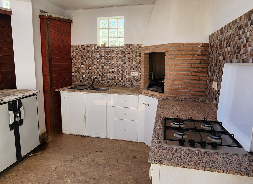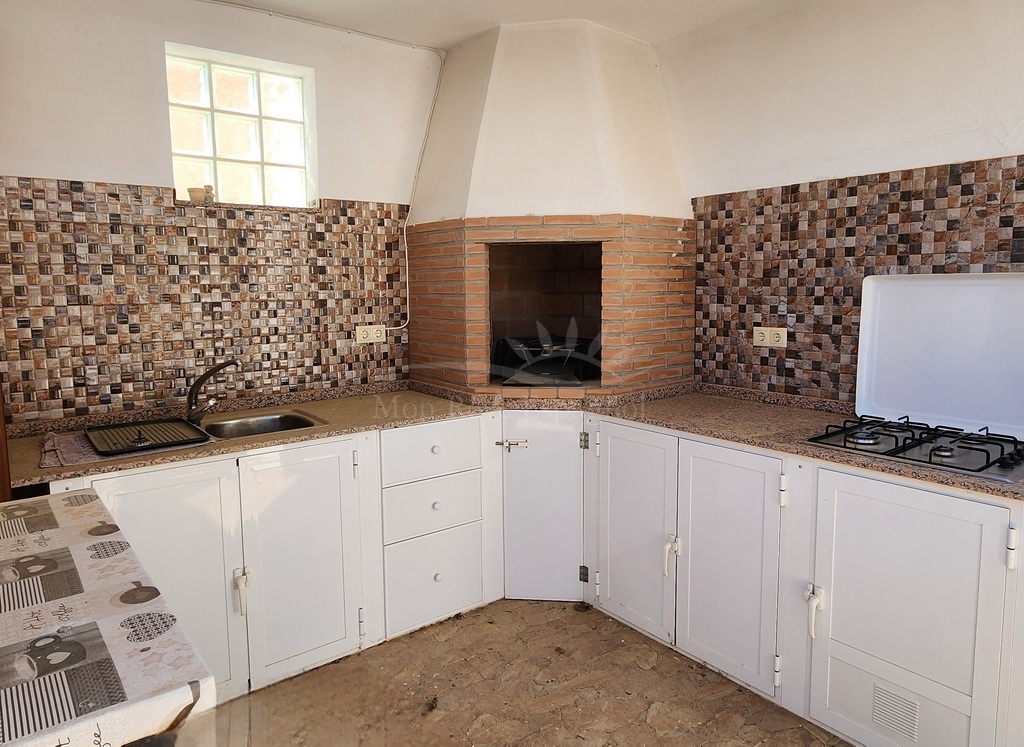 La vivienda principal se accede a través de una acogedora terraza acristalada, perfecta para disfrutar del sol durante todo el año y de las vistas al jardín. Desde aquí se accede a un luminoso salón-comedor con cocina abierta, totalmente equipada, que crea un espacio cómodo y funcional.