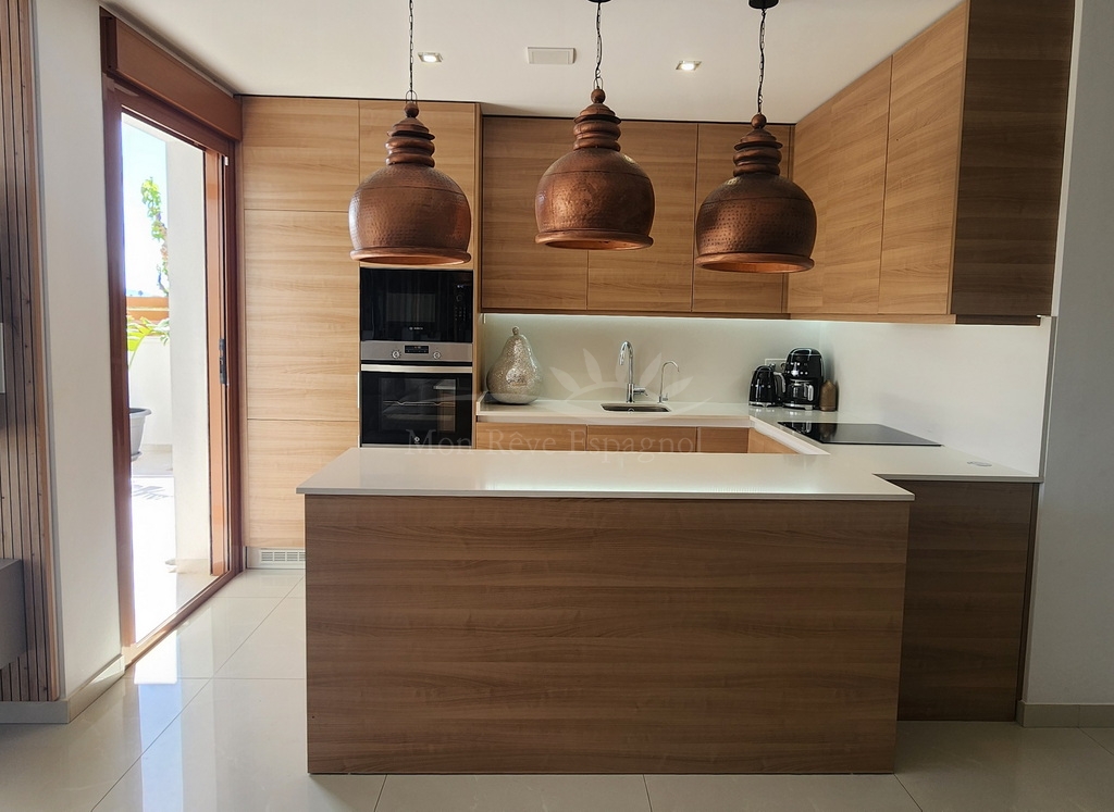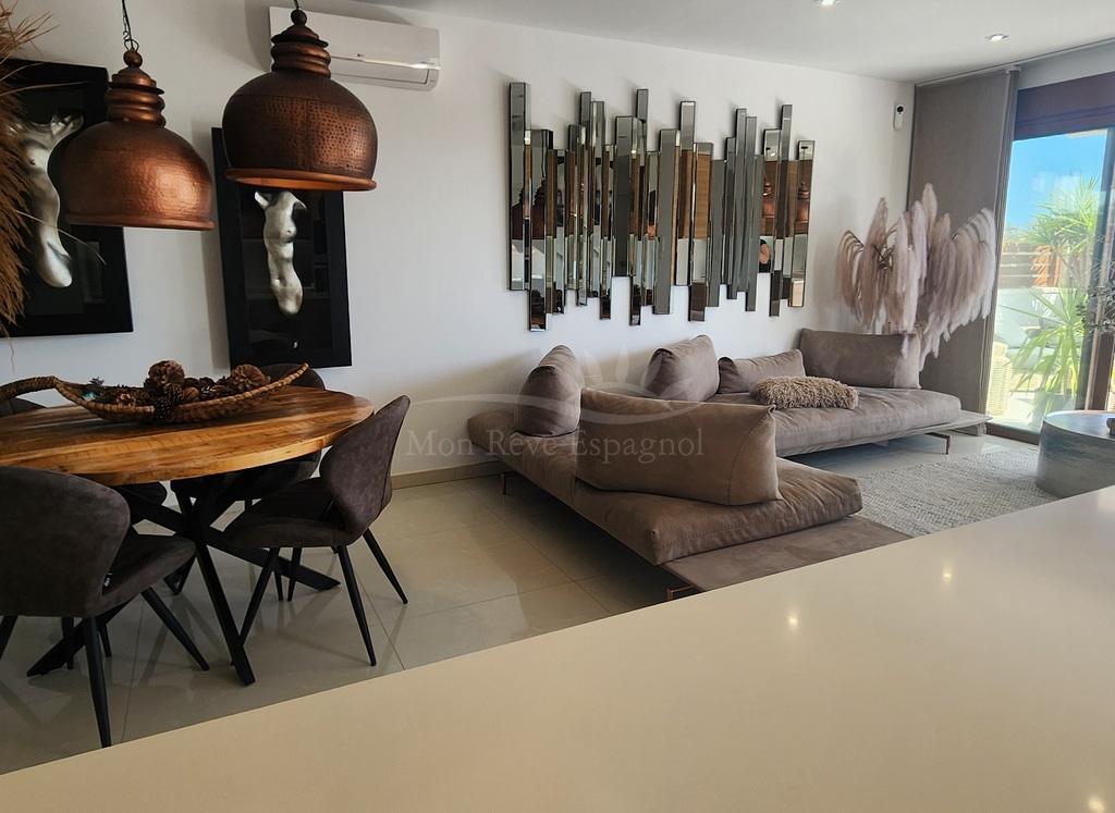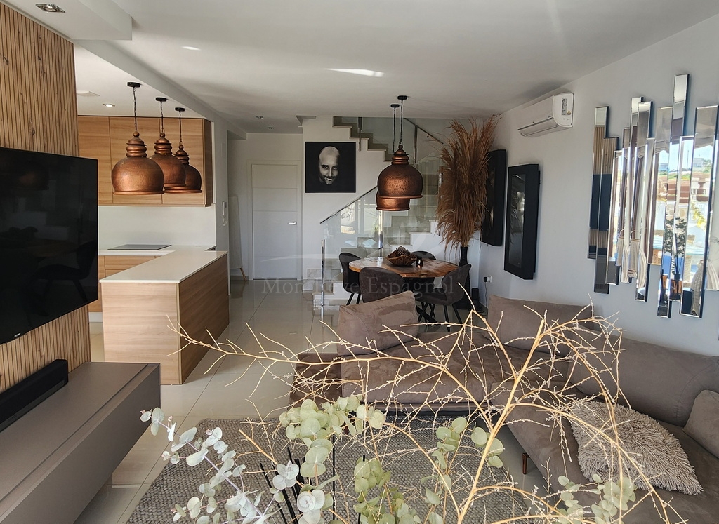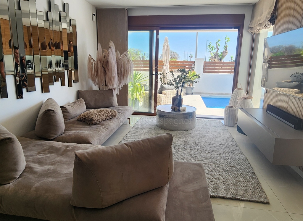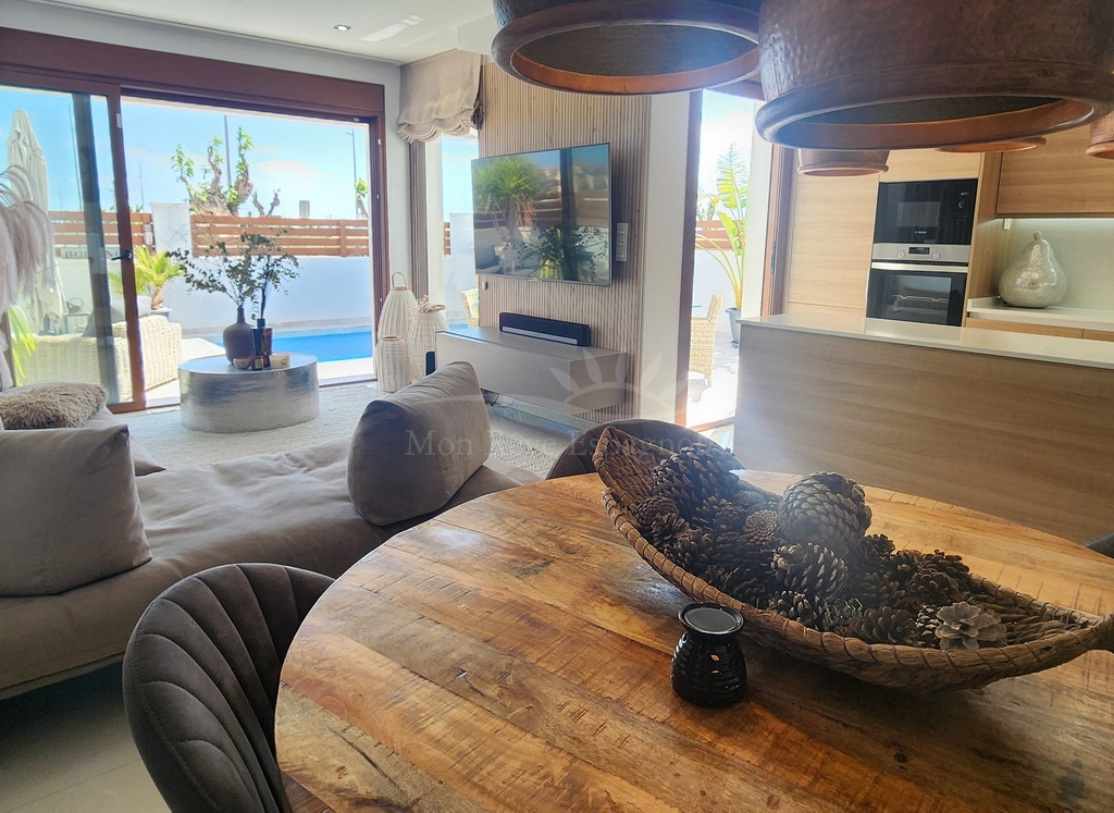 A continuación, se abre un amplio y luminoso salón-comedor con cocina americana totalmente equipada. Este espacio conecta directamente con la zona exterior y la piscina, creando una agradable continuidad entre interior y exterior. Además, dispone de galería y un acogedor patio interior, ideal como zona de relax.