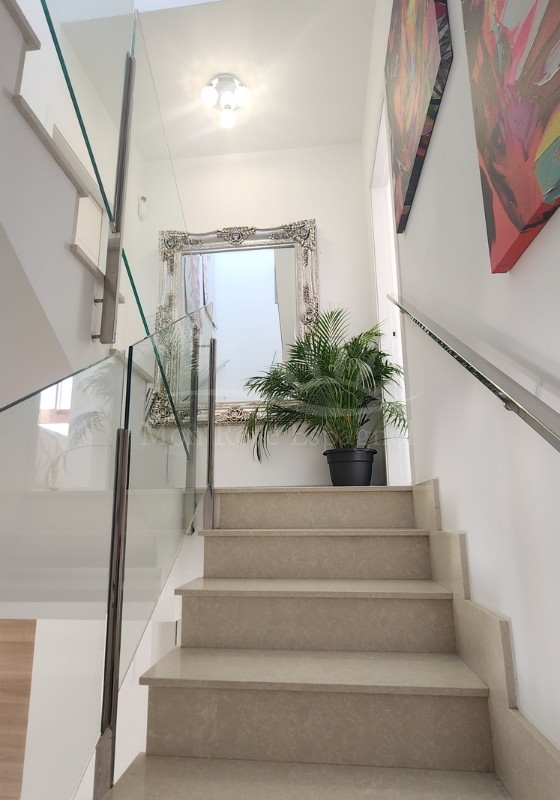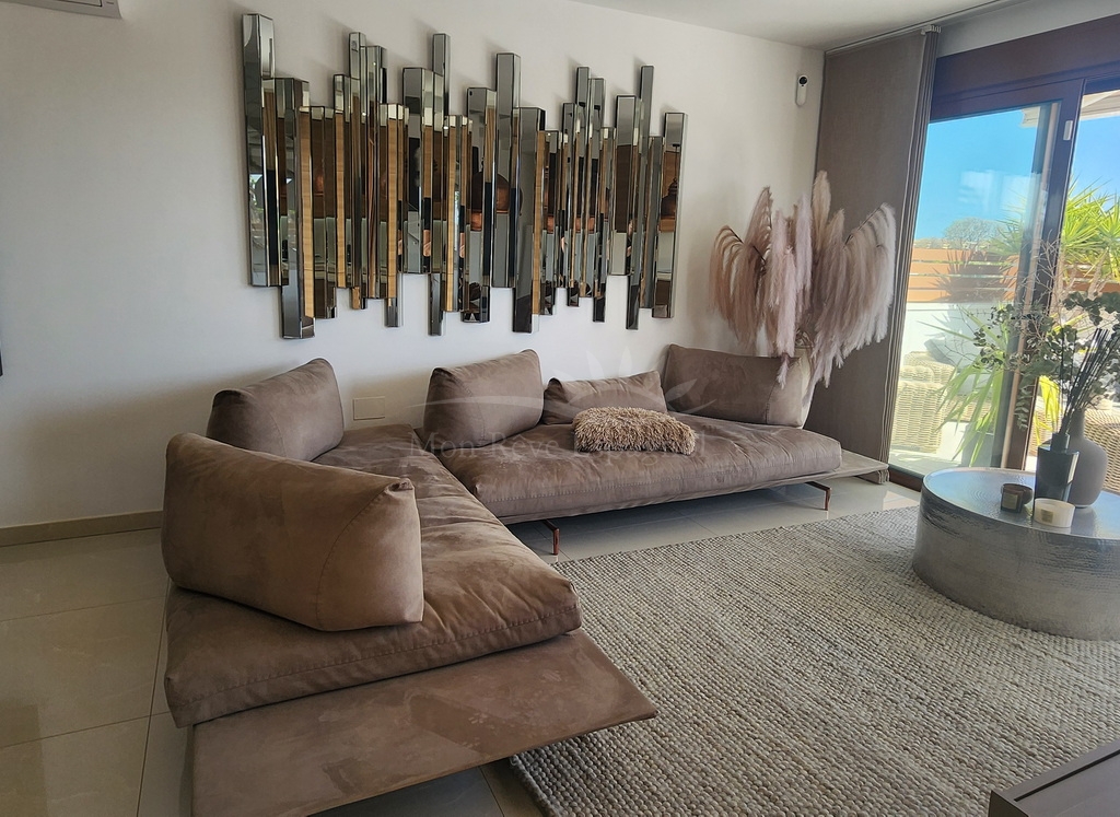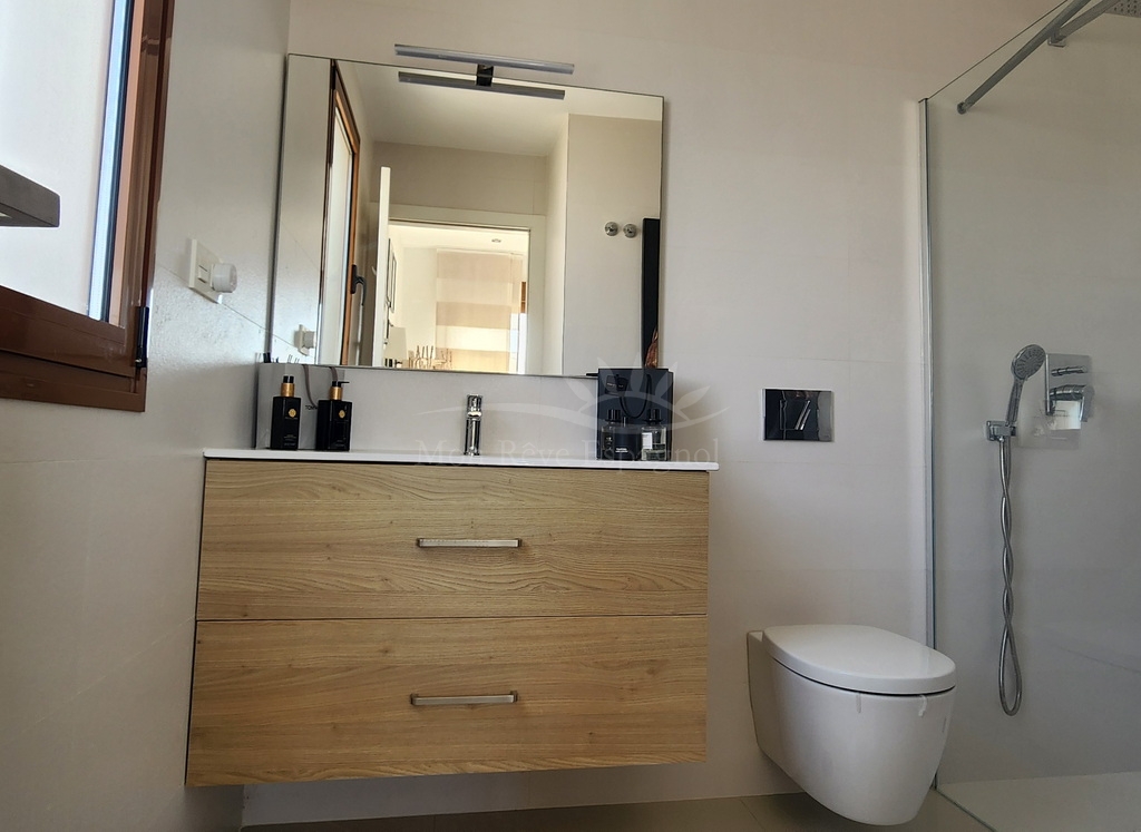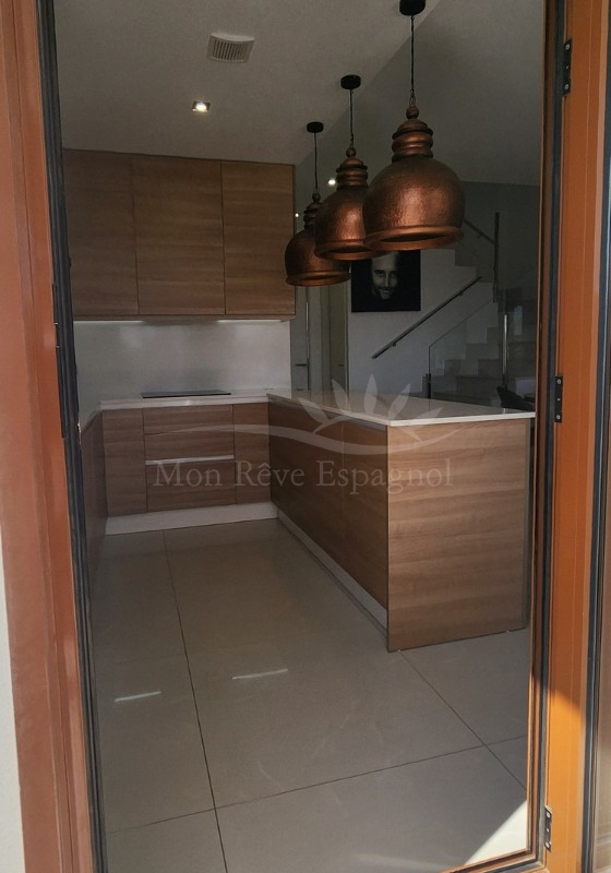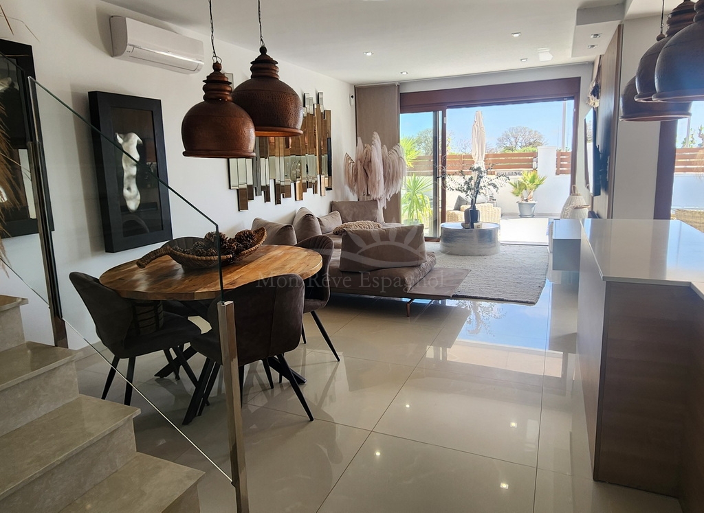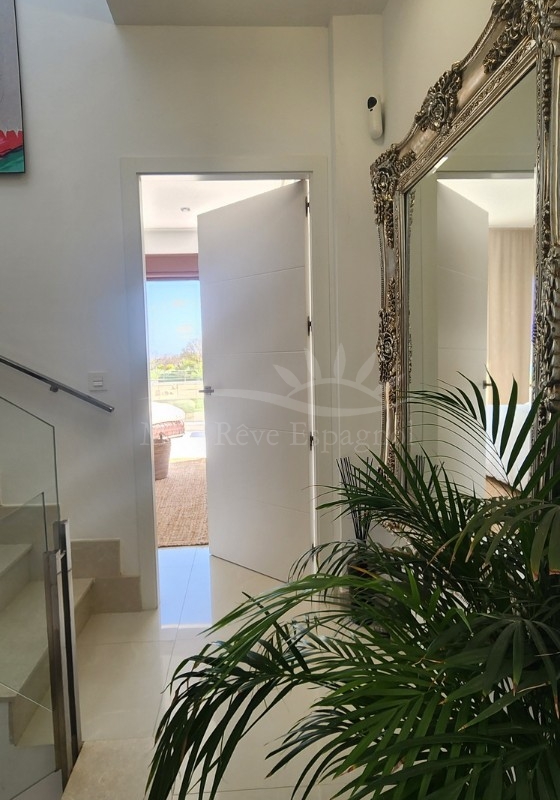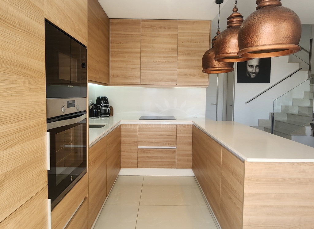 A continuación, se abre un amplio y luminoso salón-comedor con cocina americana totalmente equipada. Este espacio conecta directamente con la zona exterior y la piscina, creando una agradable continuidad entre interior y exterior. Además, dispone de galería y un acogedor patio interior, ideal como zona de relax.